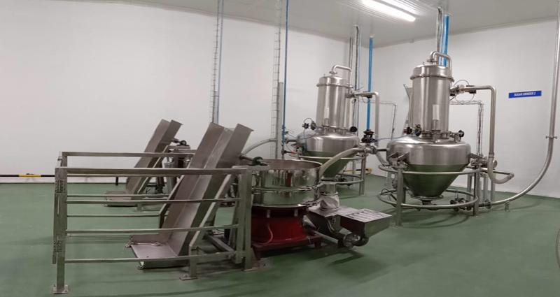Sugar bags of capacity 50 or 100 kgs are placed on bag tilter. These bags are then lifted and tilted to empty it in the weighing tank. The weighing tank is placed on load cells connected to the PLC. The vent valve and the inlet valve is open. After receiving the sugar these valves are closed. Batch Ready is displayed at the discharge end. We can also have multiple discharge points. On demand the blower and vibrator starts the discharge valve also opens to transfer the sugar pneumatically. The discharged quantity of sugar is recorded. We can get the total consumption data on the display.